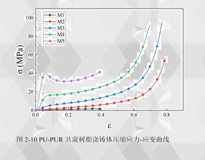 PU-PUR共混樹脂澆鑄體的壓縮應(yīng)力-應(yīng)變曲線如圖2-10所示,可以看出,M4和M5聚脲樹脂澆鑄體在應(yīng)力-應(yīng)變曲線上出現(xiàn)了明顯的線彈性階段和屈服階段。在應(yīng)變達到0.39的時候M1聚氨酯和M5聚脲樹脂澆鑄體都已經(jīng)處于變形失效的狀態(tài),聚氨酯澆鑄體發(fā)生扭曲變形失效,聚脲澆鑄體發(fā)生脆性斷裂失效。而共混樹脂澆鑄體M2、M3和M4在應(yīng)變達到0.5以上時才開始逐漸失效且擁有更長的平臺段,失效應(yīng)變分別為0.64、0.59和0.51。說明在應(yīng)變率較大的情況下,M2、M3和M4樹脂澆鑄體的壓縮力學性能 要強于單獨的M1聚氨酯和M5聚脲,可以承擔更大的壓縮位移而不失效。